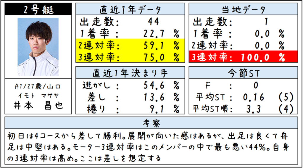 ②井本選手は、初日には展開を捉える差しで勝利しています。モーターの成績は悪いんですが、初日のレースを見る限りでは回り足が良くて回った後の出て行く感じも良かったです。