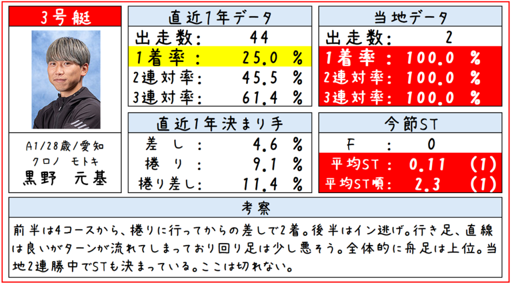 そして③黒野選手ですが、初日のレースでは行き足がよくて絞っていくような気配もありました。このレースでも早いSTから捲り差していくと思っています。STも決まっているし、桐生の3コースは2連勝中ということもあり、ここは黒野選手の2着というのはやはり十分にあり得ると思います。