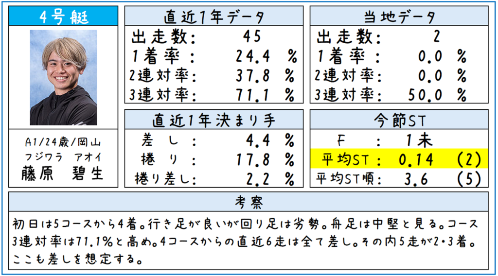 ④藤原選手は差しを想定していますが、STがそこまで行けないとも思っていますので、この差しは届かないと見ています。ただ、3連対率は高く、2マークの展開によっては3着はあると思っています。