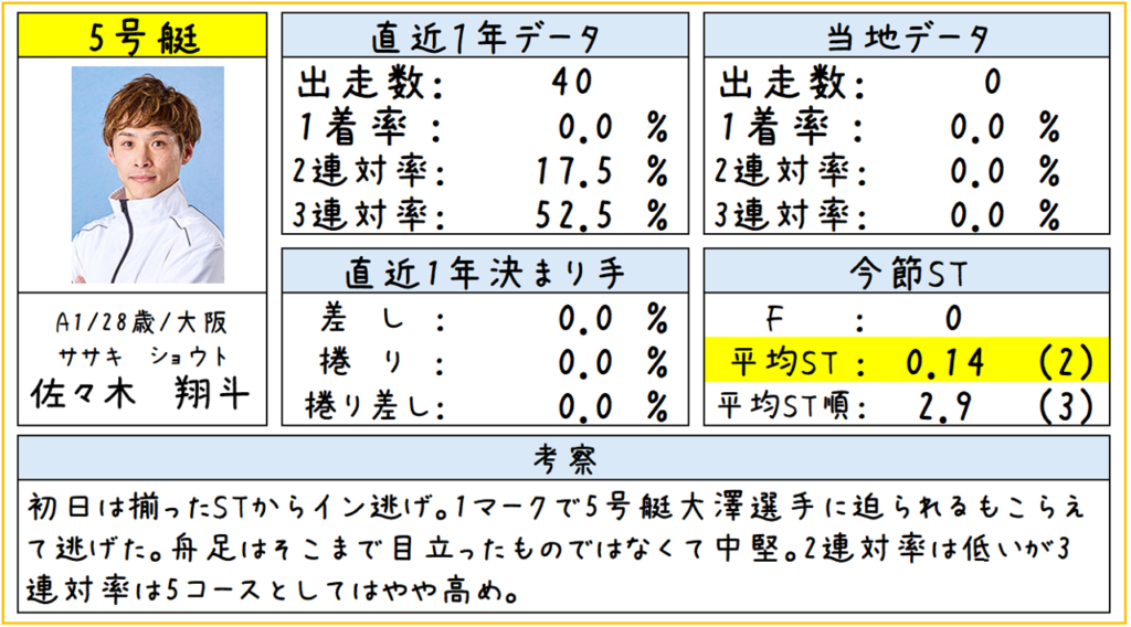 ⑤佐々木選手は舟足の面からもデータの面からも②井本選手③黒野選手には少し劣るかなと見ていますので、④藤原選手同様ここはあっても3着までとしました。