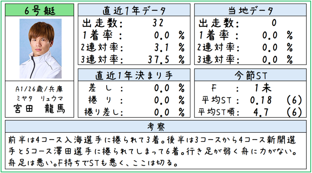 また、⑥宮田選手は舟足が悪いと見ているしF持ちでSTが決まっていないということもあるので切っていきます。