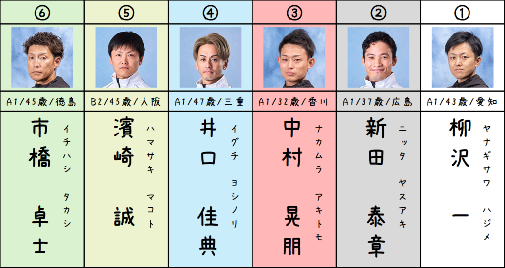 ①の柳沢選手が圧倒的に良くて、その次に②新田選手、③中村選手、そして⑤濱崎選手が来て④井口選手と⑥市橋選手が少し弱めと考えています。