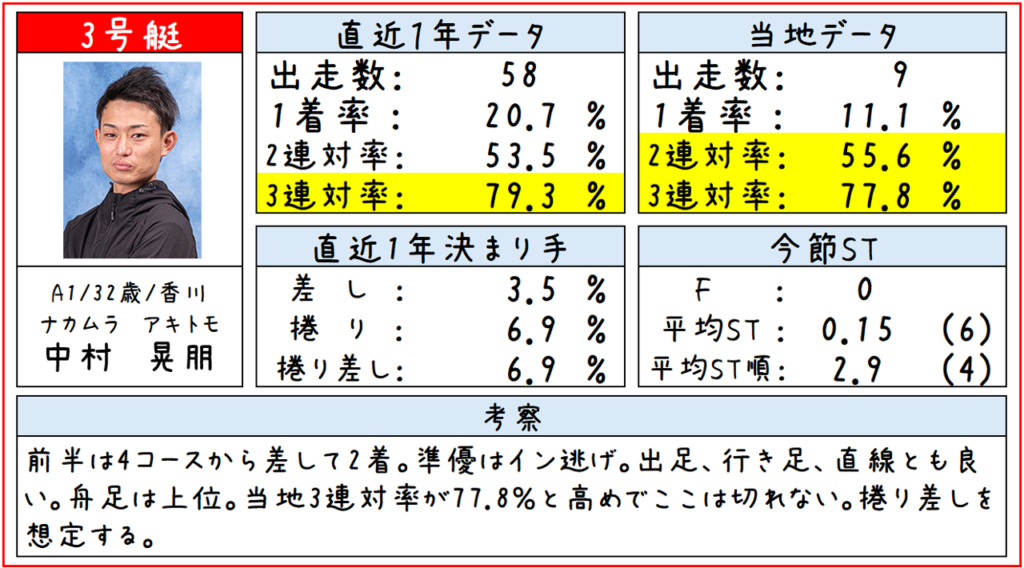 そして②新田選手は舟足も万全だし、③中村選手も同様です。