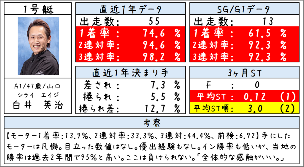 白井選手の負けパターンは、2コースからの差しと3コースからの捲り差しで負けることが多いです。