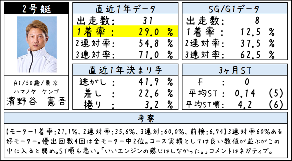 まず、②濱野谷選手。手にしたモーターは好モーターではありますが、STが遅めであること、選手データを見てもこの中では劣勢になることから二着は厳しいと見ます。