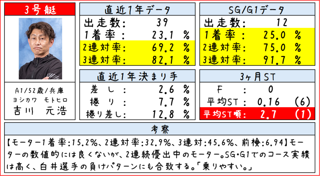 そして③吉川選手は、モーターが二連続優出中と直近の気配が良いモーターであることと、早いSTであること。一つ内の濱野谷選手がST遅めであること。そしてSG/G1での2連対率が75%と高いことからここは捲り差しが入っていくことを考えたいです。