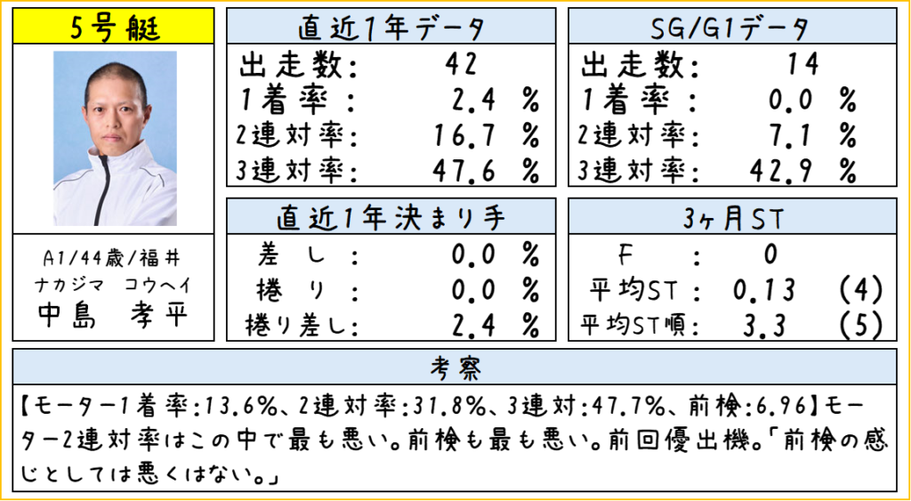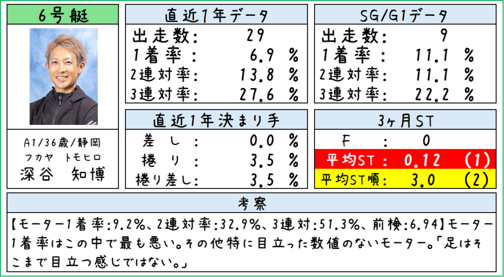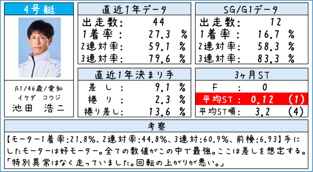また、④池田選手はモーターの成績がこのメンバーの中で最も高くSTも安定しています。