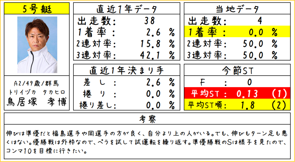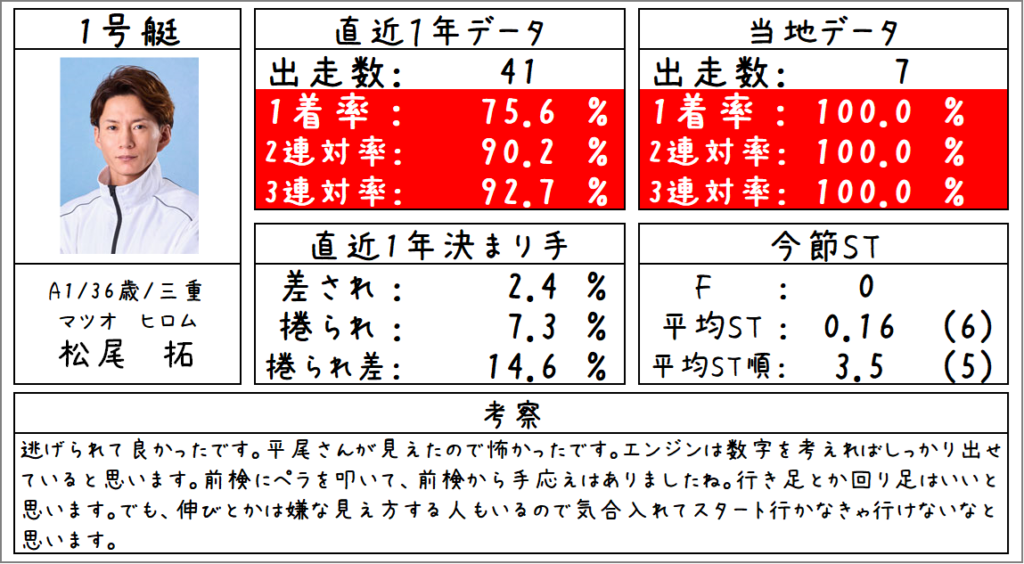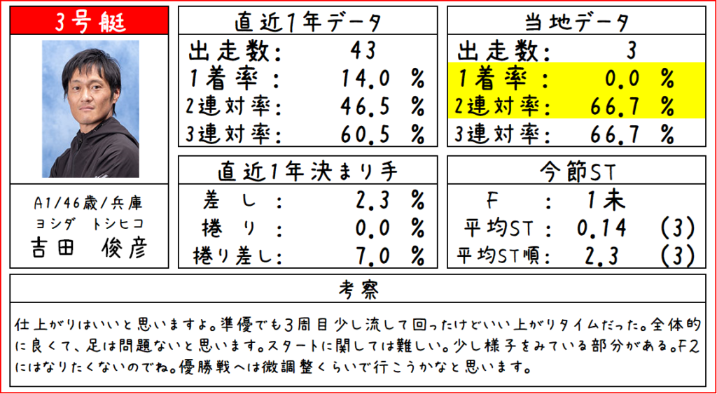 また、今節は既に6コースから3着に残している実績もあり、ここも同様に3着に残してくる可能性は高いのではないかと思いました。