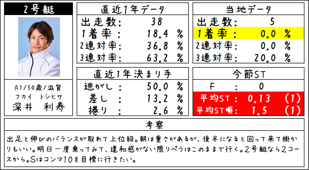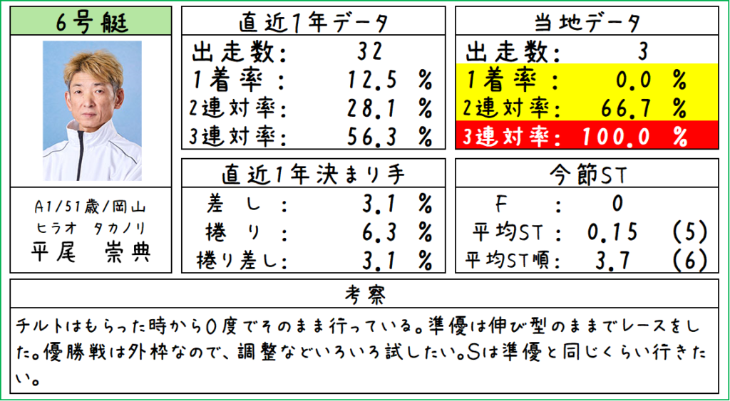 一般戦データを見てみると、直近一年間での3連対率は56.3%と6コースの数値としてはかなり高いです。さらに、当地データを見てみると直近2年間では3連対率100%となっています。当地の出走回数は3走と、それほど多くはありませんがそれでも数値を残しているということは好材料です。