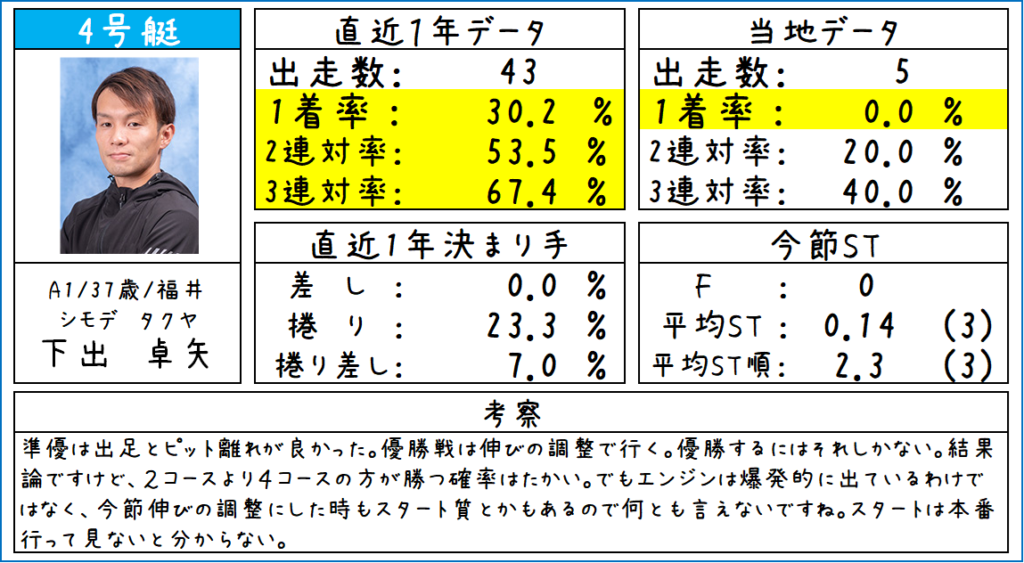 優勝戦では4号艇の下出選手が捲りに来ることを想定しています。