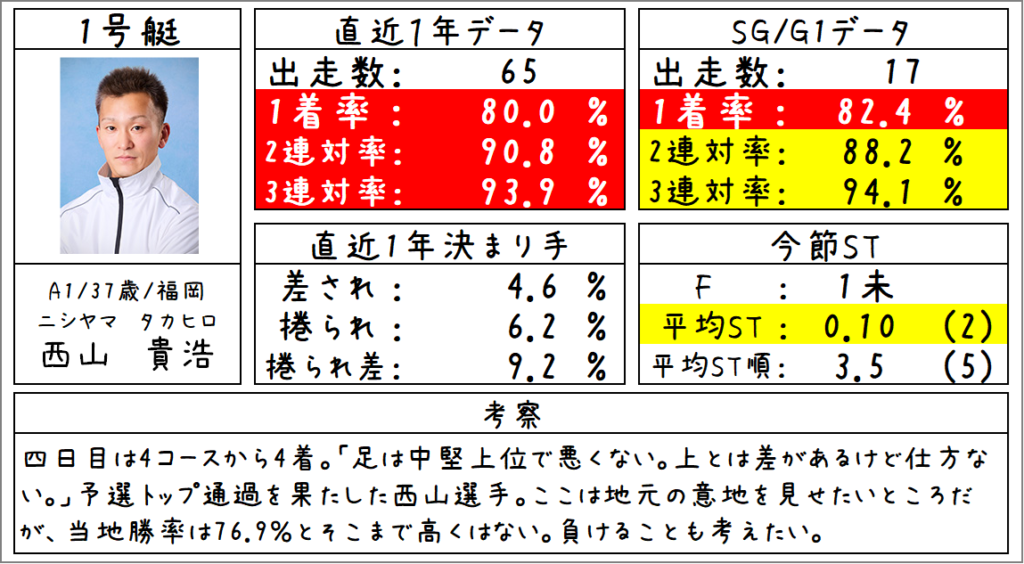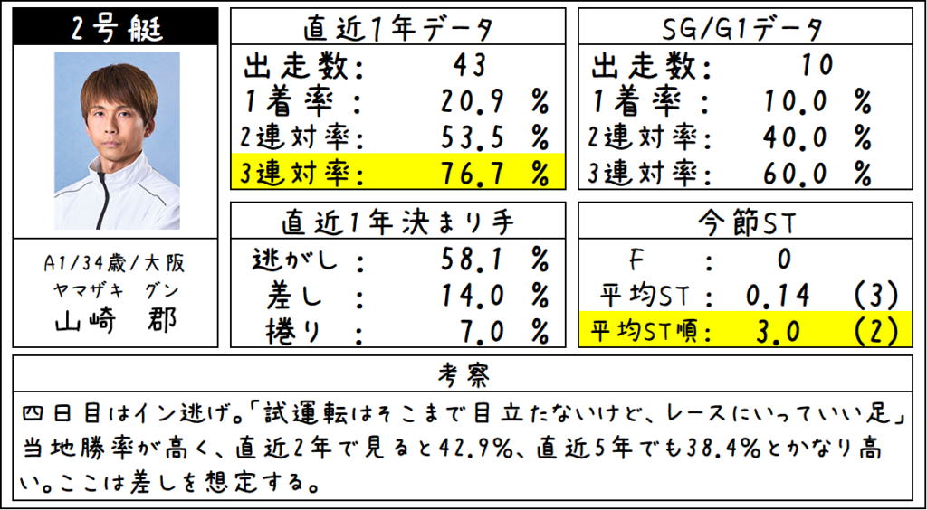 山崎選手の3連対率が60%となっており、全く引けを取らない数値になっています。