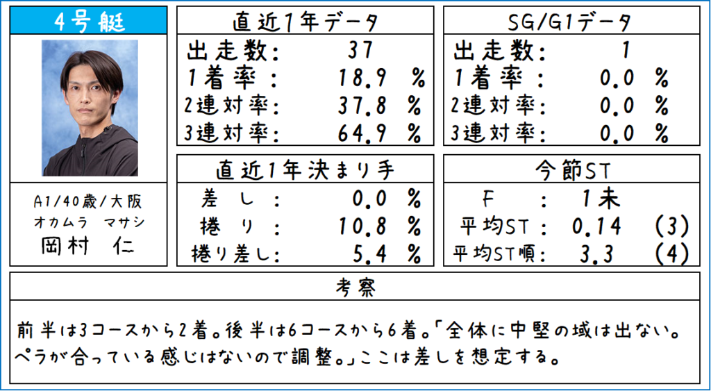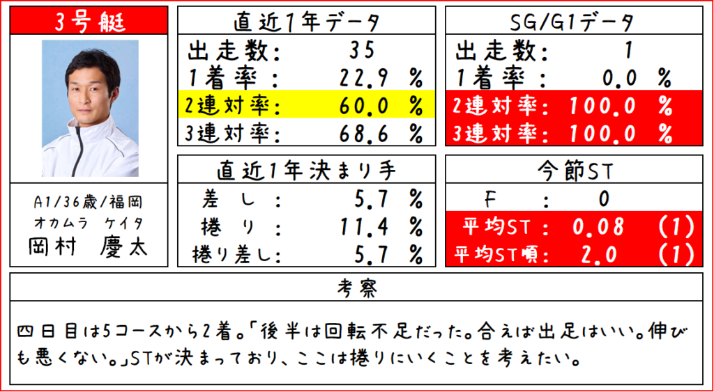 レースの展開としては、③岡村慶太選手が早いSTを決めて捲りに行く展開を想定しています。