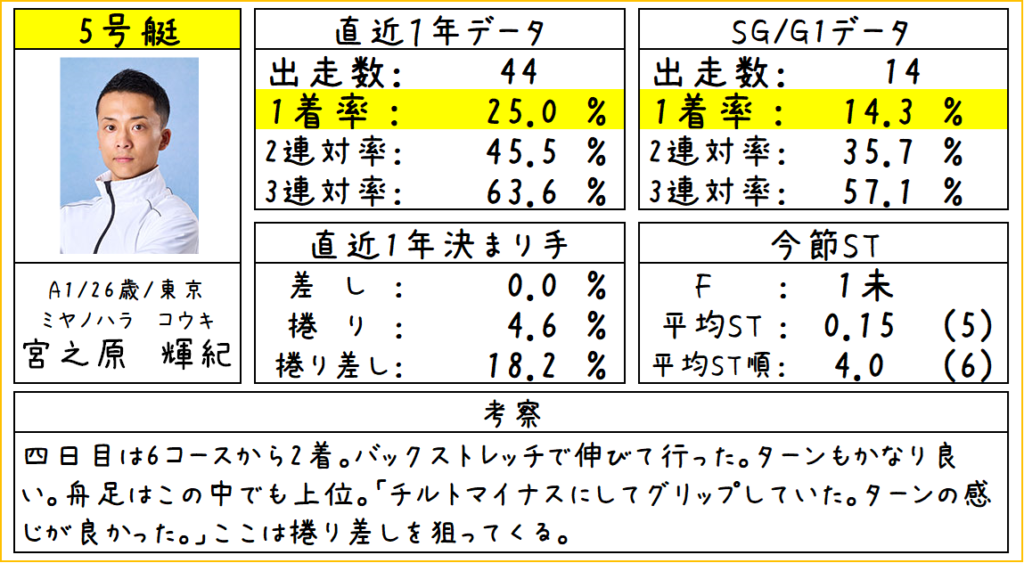そして宮之原選手は5コース実績も高く、SG/G1での3連対率は57.1%あります。