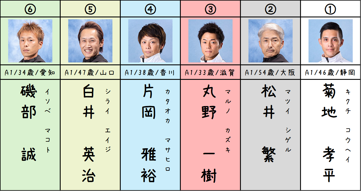 【モーター1着率:11.1%、2連対率:31.5%、3連対率:56.5%、前検:6.62】このメンバーの中でモーター3連対率が最も高い。当地勝率は直近2年で33.3%。先日徳山G1で優勝したばかり。「足は普通くらいだと思うけど、起こしや乗り心地がしっかりしている。」