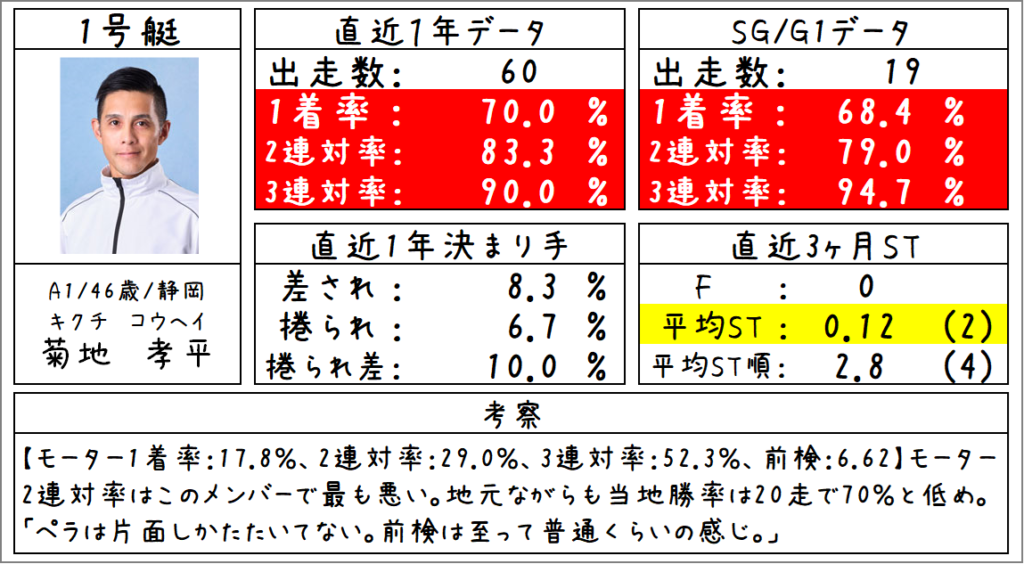 菊池選手の勝率は一般戦データ・当地データともに70%。SG/G1で見ると68.4%と結構悪いです。モーターの2連対率はこのメンバーで最も悪く、負ける可能性もあるかと思っています。