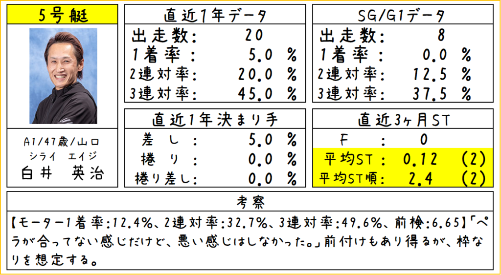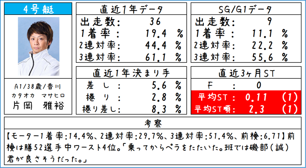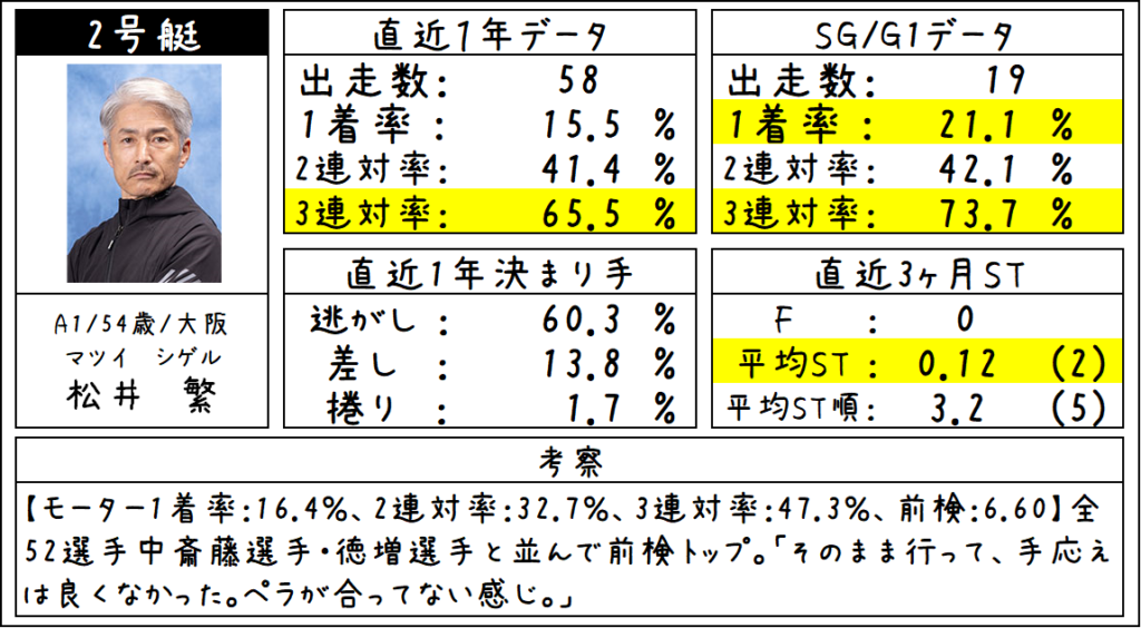 手にしたモーターはまずまずの数値を残しているし、前検タイムが全出走選手中最も良かったというのは好材料です。コース実績も高く、SG/G1での3連対率は直近半年で19走して73.7%と高い。よってここは切れません。