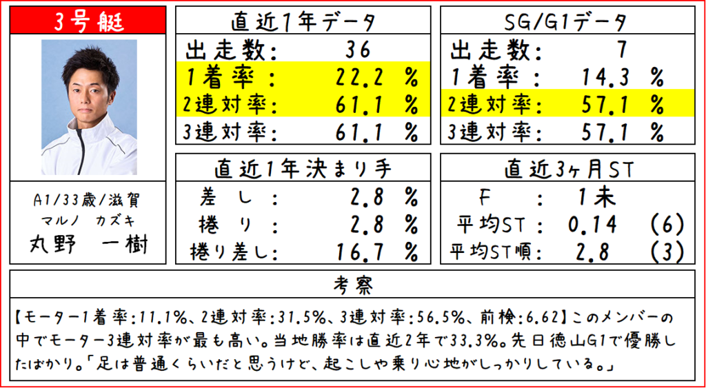 丸野選手の勝率は一般戦で22.2%あり徳山の前走3コース戦では捲り差しを決めて勝っています。ここも同様に頭までくる可能性はあると思います。