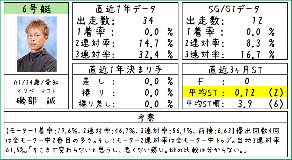 手にしたモーターはモーター2連対率が全モーター中トップの46.7%。そして優出回数も4回と多く、今節も期待の持てるモーターです。また、磯部選手自身の当地三連対率は61.5%とかなり高く軽視できません。ここは大外になりますが、最内を突く差しが入って行くのではないかと思います。