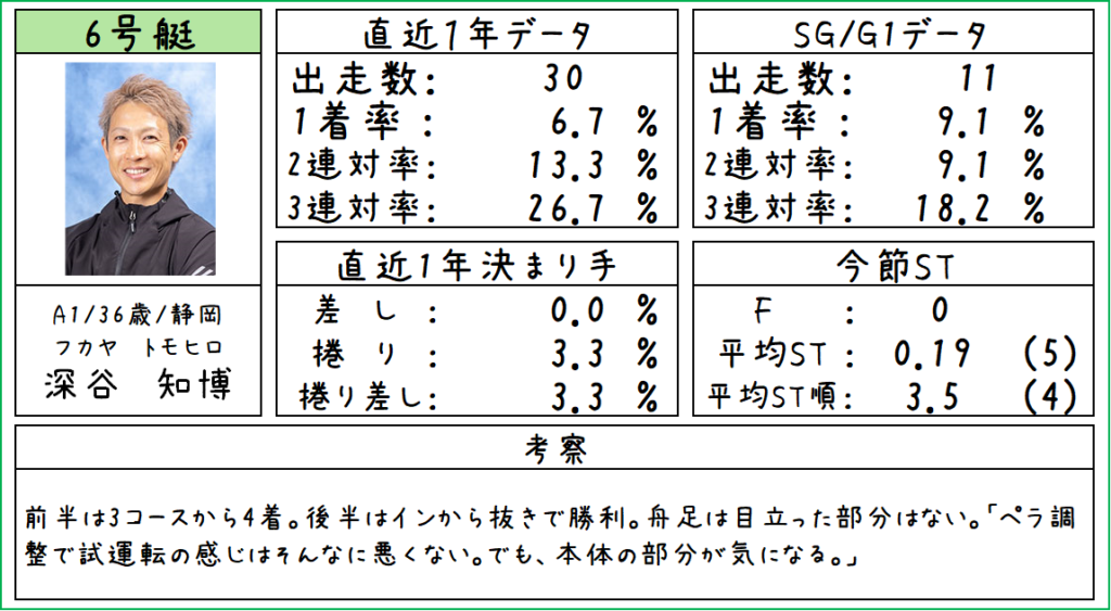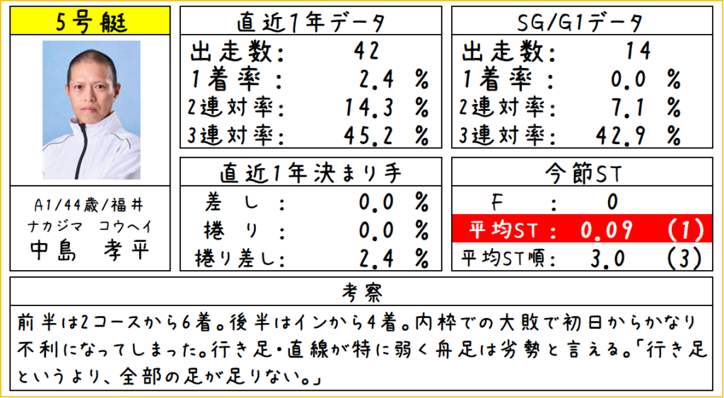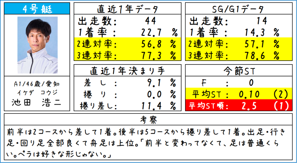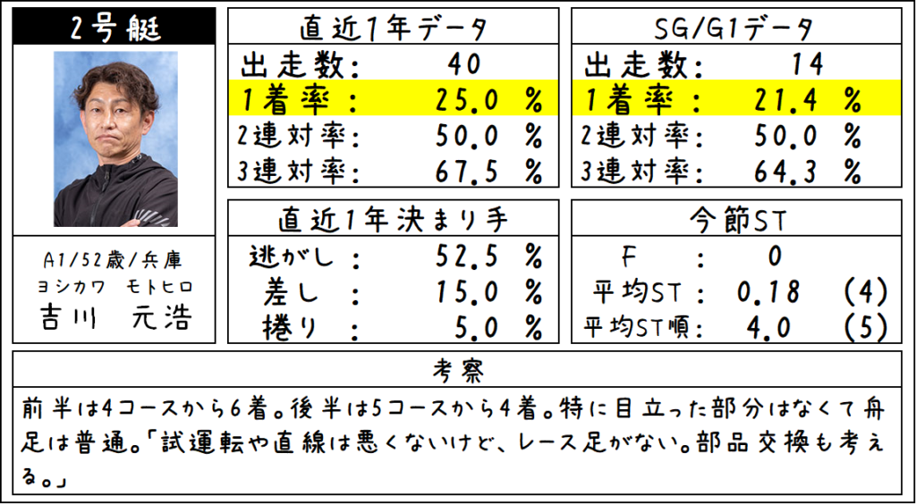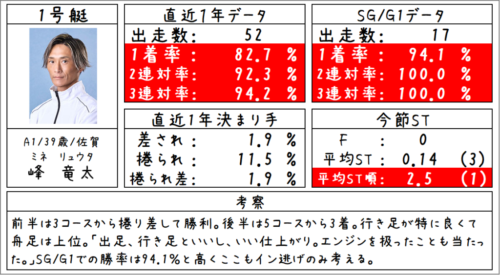 データ的な見地からは、2連対率がこのメンバーの中で峰選手に次ぐ数値となっていますね。
