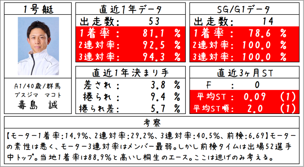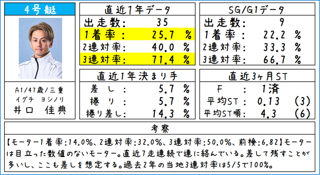 モーターもこの中では好機になりますし、当地3連対率は78.6%とかなり高いです。そして、SG/G1での2連対率を見てみると5/15で33.3%となり、これは④井口選手と同じ数値となります。