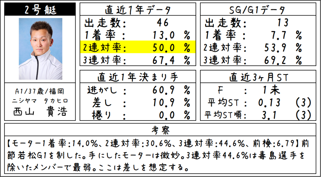 まず、②西山選手、前節若松G1を制しての参戦ということで最高の流れにはなりますが、ここは切る事としました。
