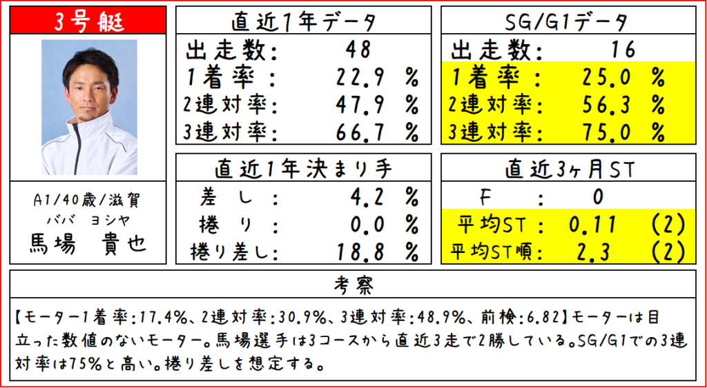 ③馬場選手は、3コースからの捲り差しの名手ですし、SG/G1での3連対率は75%と高いです。