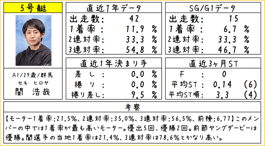 そして⑤関選手ですが、前回ヤングダービーでは地元の意地を見せつけて見事優勝しましたし、初日ドリームでは5コースから捲り差して勝っています。