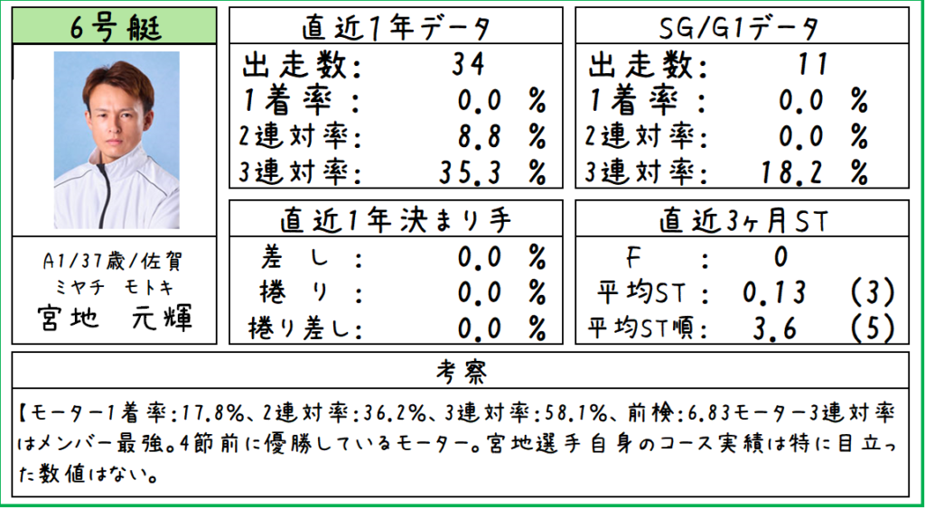 【モーター1着率:17.8%、2連対率:36.2%、3連対率:58.1%、前検:6.83モーター3連対率はメンバー最強。4節前に優勝しているモーター。宮地選手自身のコース実績は特に目立った数値はない。