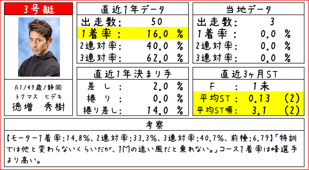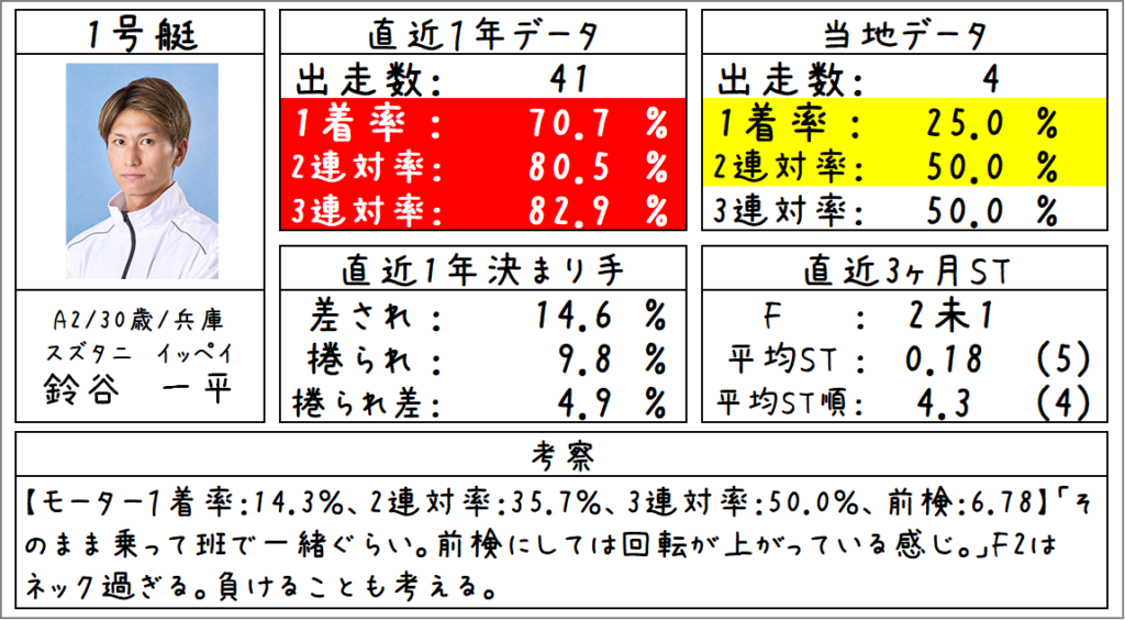また、モーター1着率は34.5%とかなり高い数値となっておりこれもこのメンバーでは最も高い数値です。そしてST。平均STが.10、ST順が2.7番となっており、これもこのメンバーで最も早いSTとなっております。