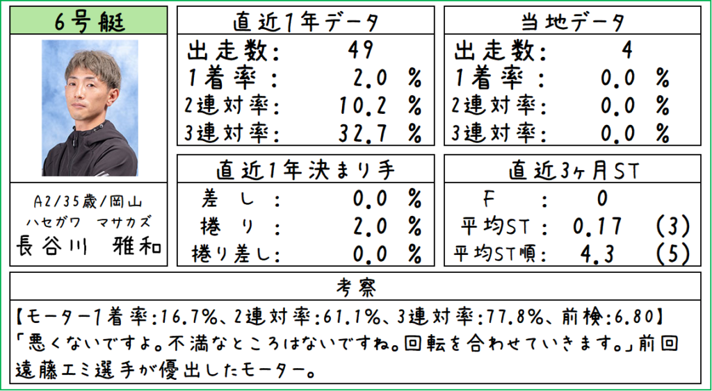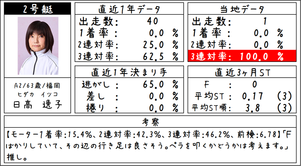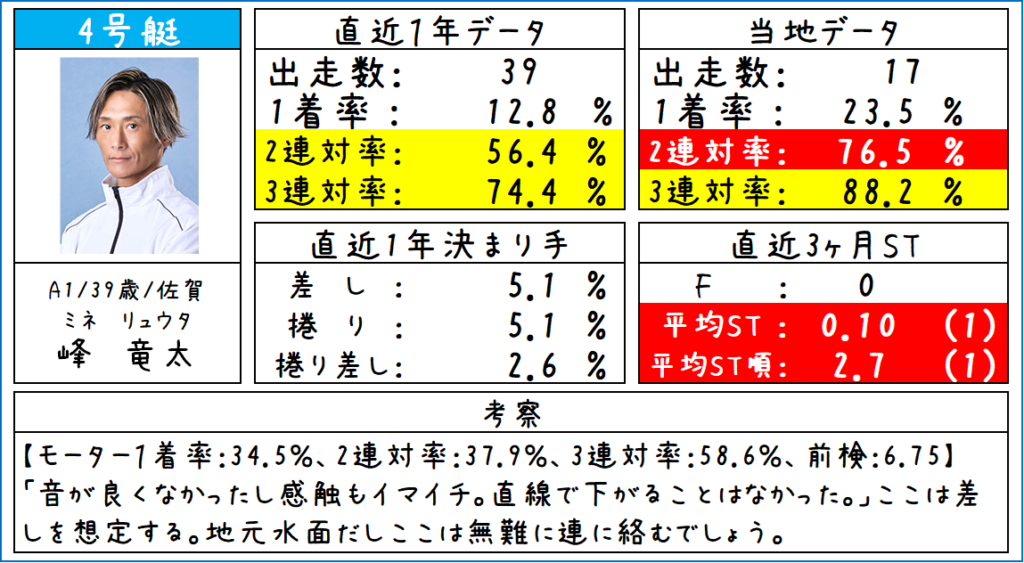 そしてコース実績。一般戦データでは70.7%と普通の数値ですが、当地唐津でのデータを見てみると、4走しかしていませんが1着率25%と、かなり低い数値になっています。