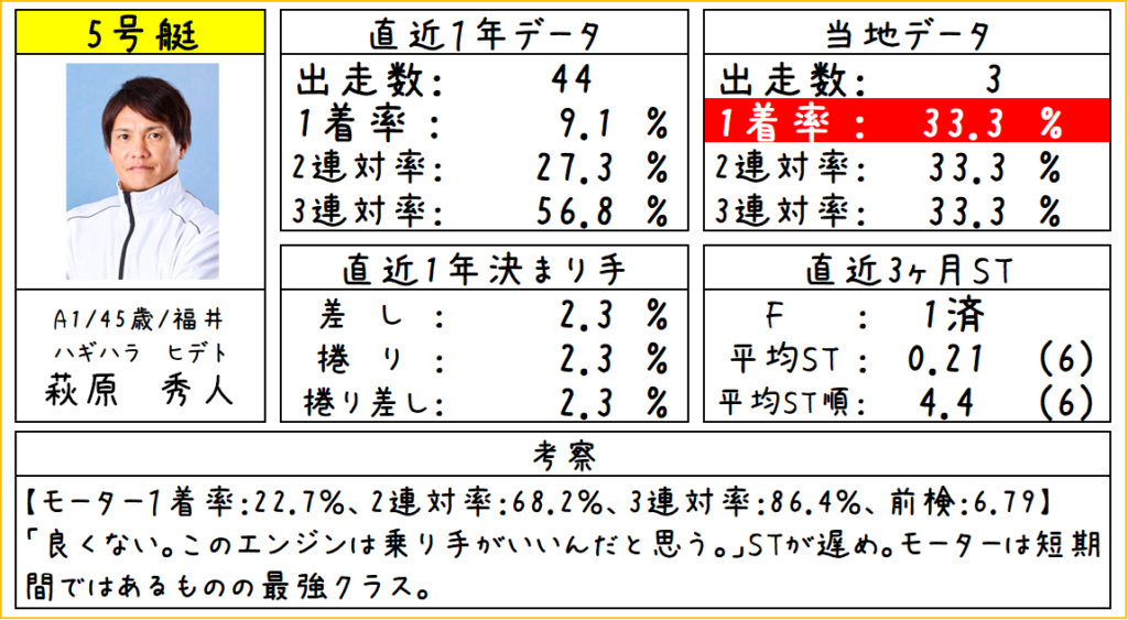 また、モーターの1着率は14.3%ですがこの数値はこのメンバーの中で最も悪い数値になっています。