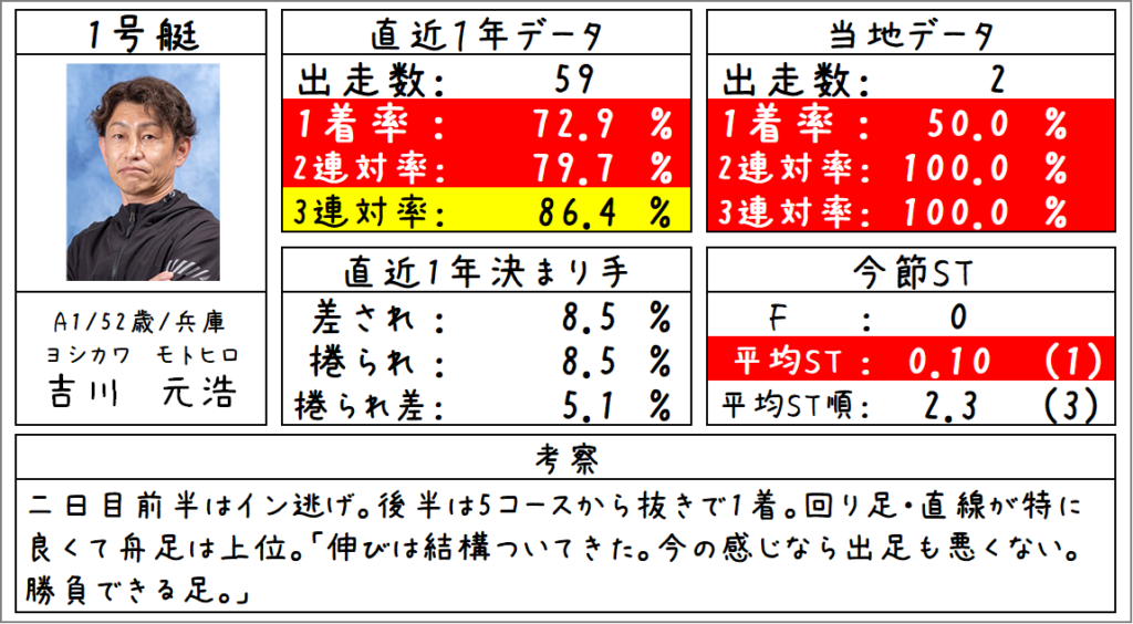 前半は5コースから2着。後半は3コースから1着。ターン回りが特に良いし直線も出ている。舟足は上位と見ている。「伸びとかは心配だったけど、特訓で大丈夫だと思った。これ以上は求めてない。」