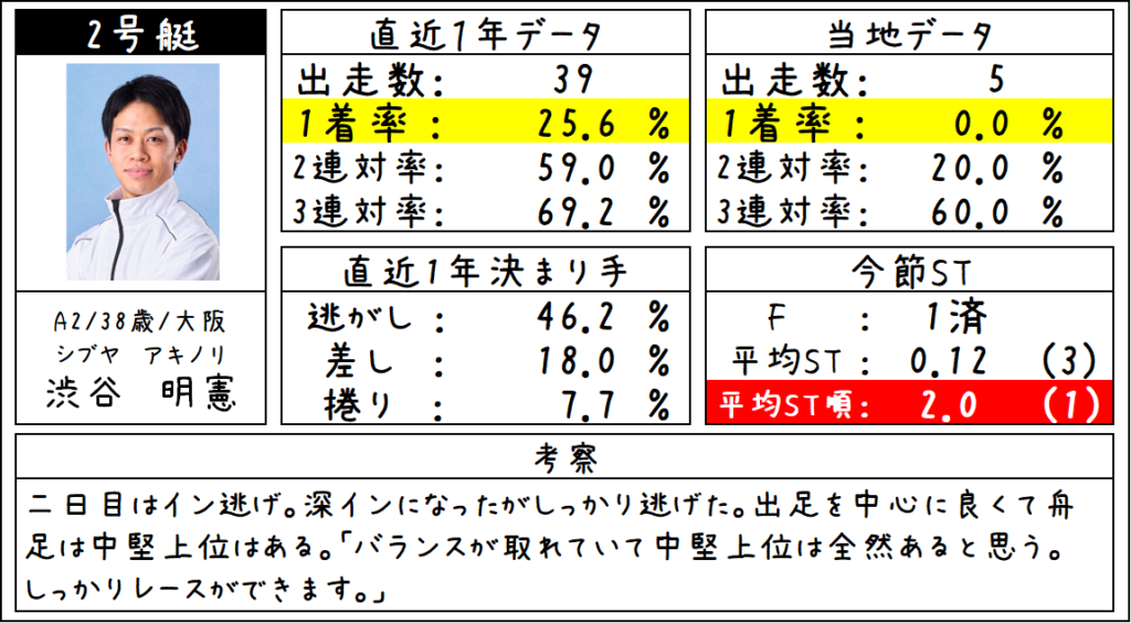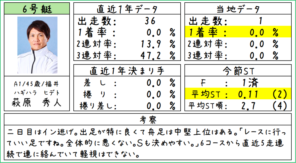 前半は5コースから3着。後半はイン逃げ。イン戦ではしっかりSTを決めた。舟足は目立ったところはなくて中堅クラスと見る。「本当に普通ですね。まだ前半の方が良かったかな。タイムも出てないですし。」コース実績はとても高く、切れるデータではない。