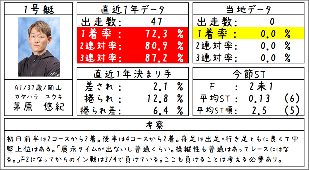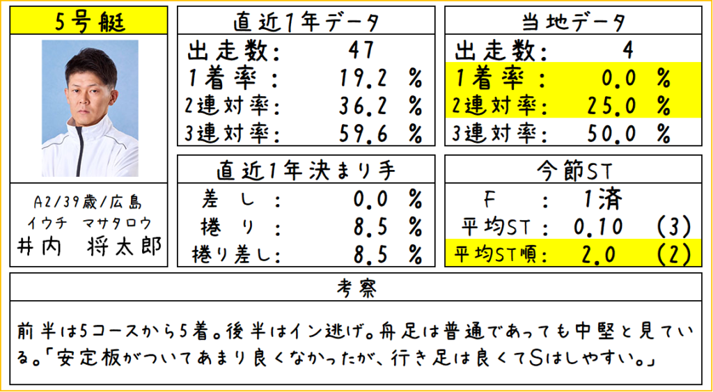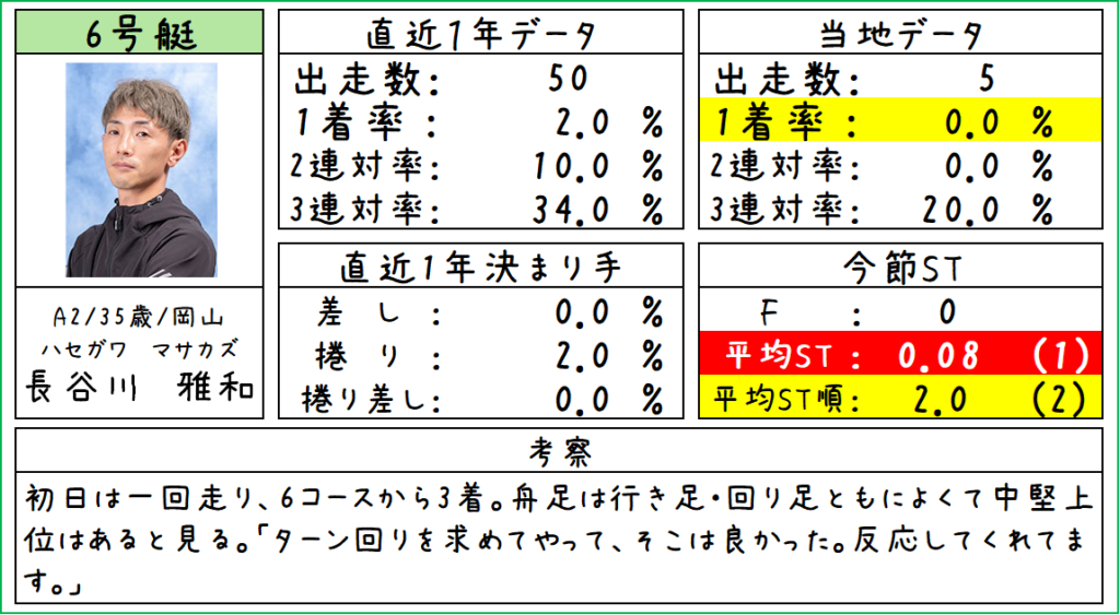 前半は5コースから6着。後半はイン逃げ。舟足は目立ったところはなくて普通。中堅クラスと見ている。「前検から体感がいいので何もしてない。行き足が良くてSはしやすい。」コース実績は高め。