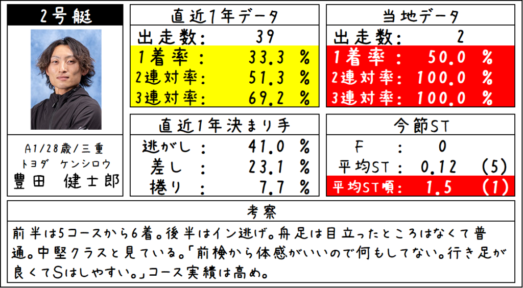 ②豊田選手は2連対率が51%となっておりこの数値はこのメンバーの中では茅原選手に次いで高い数値となっています。STを見てみても、初日のST順はこのメンバーの中で最も早い1.5番手となっています。舟足は中堅と見ていますが、早いSTから差していっての2着。これは全然あると思います。
