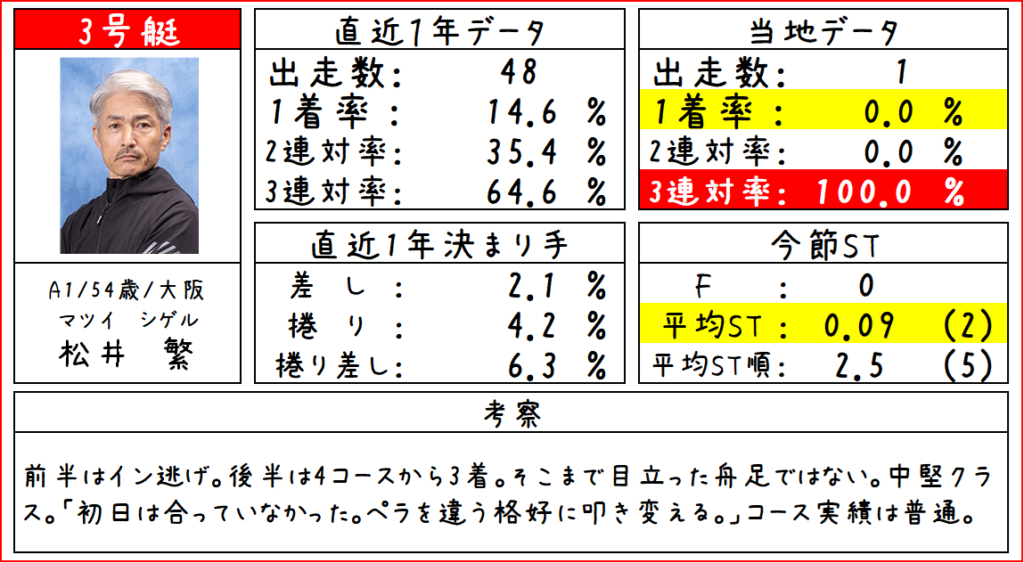 そして③松井選手。初日の舟足はそこまで目立ったものではなかったし、ターン回りもいまいちな印象を持ちました。コース実績も2連対率35.4%と、3コースの実績としてはやや弱い数値です。