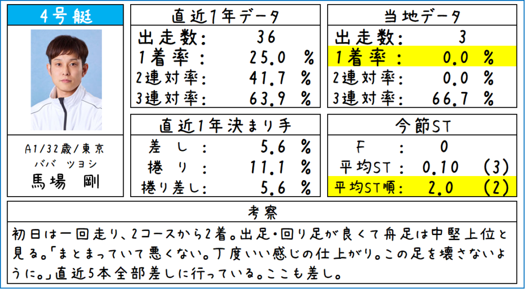 そして④馬場選手、初日の舟足は出足・回り足が良くて中堅上位と見ています。コース実績も2連対率41.7%あり、差しが伸びていって2マークのターンが決まれば2着まで。ということも考えられます。