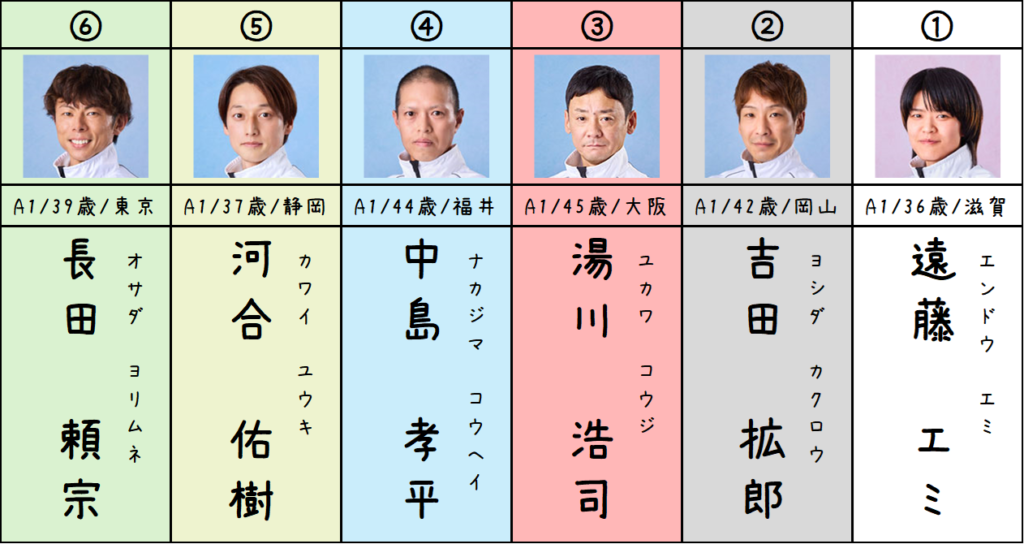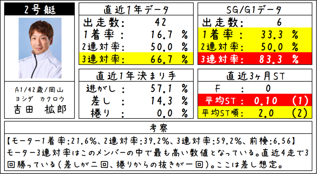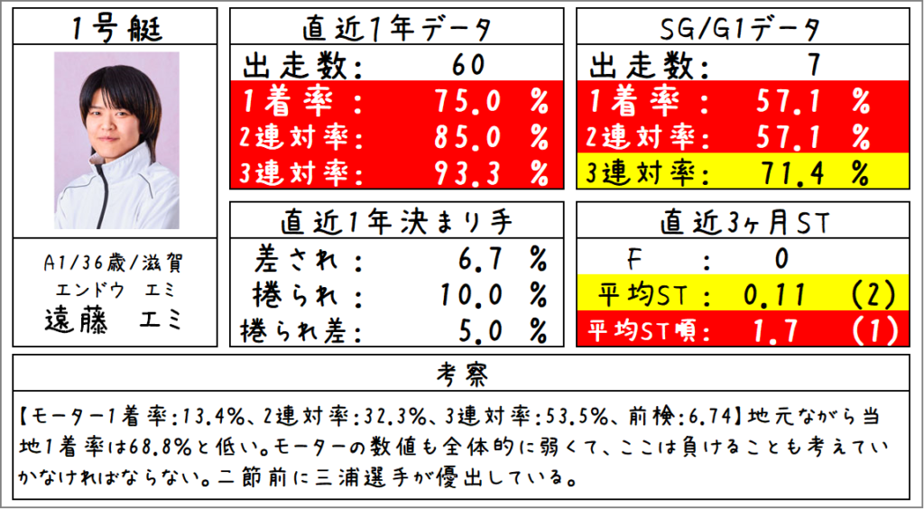 まず②吉田選手、コース実績が優秀です。2コースからの直近4走で3回も勝利しています。差し捲り自在で、もし遠藤選手が遅れれば捲ってくることもあるかと思います。ただ、ここは遠藤選手のSTも良いので差しを想定はします。