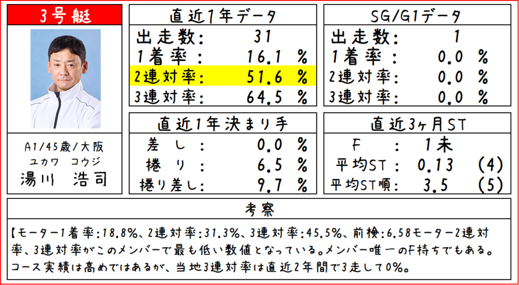 まずモーターが弱めです。モーター2連対率・3連対率ともにこのメンバーの中で最も悪い数値となっています。