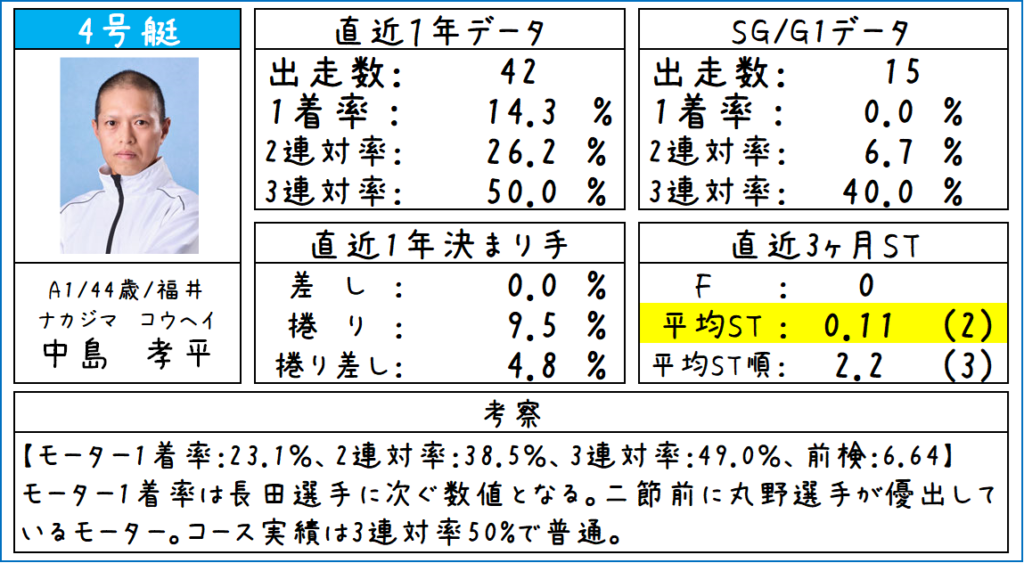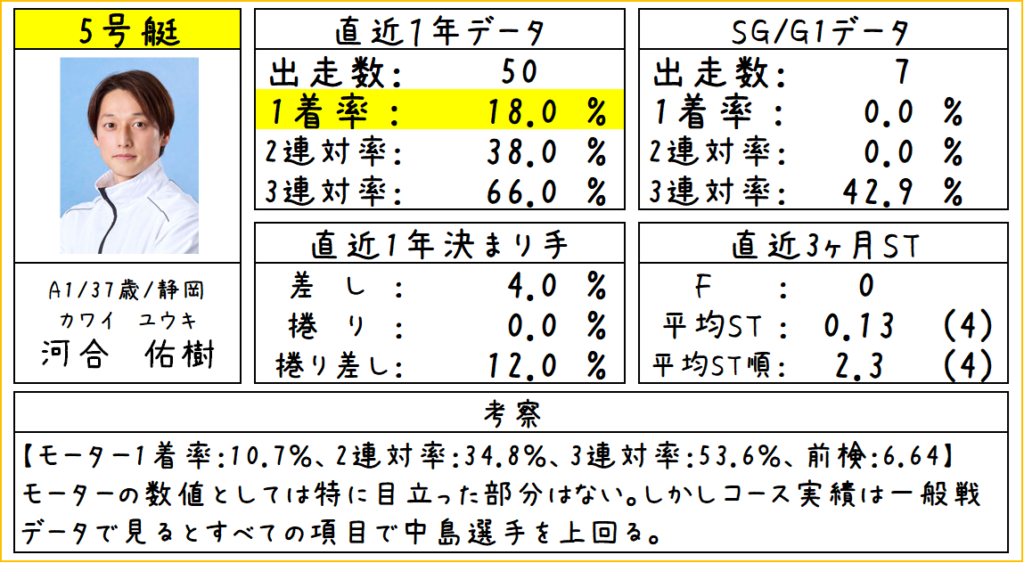 河合選手はモーターこそ目立った数値を残しているモーターではありませんが、コース実績が高く、1着率、2連対率、3連対率のすべての数値で④中島選手を上回っています。