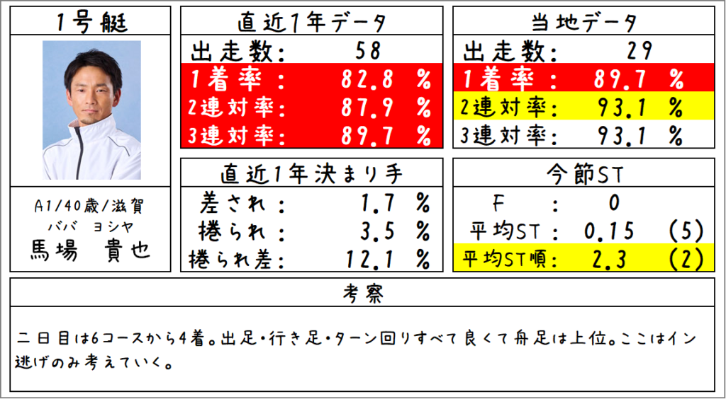 1号艇は馬場選手。直近一年間のイン勝率は82.8%。2連対率は87.9%。3連対率は89.7%。