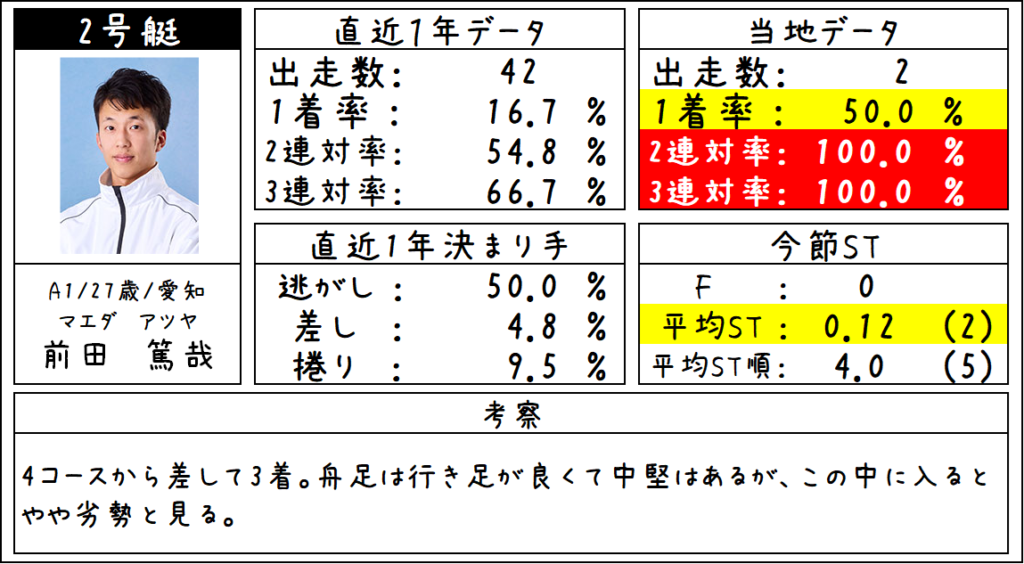 田村選手も舟足がかなり良いと見ていますので、コース実績こそ乏しいものの、ここは切れないと思ってます。