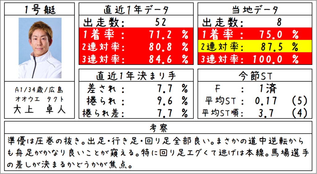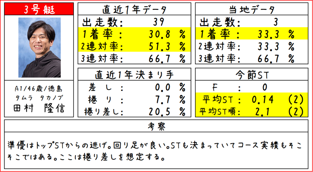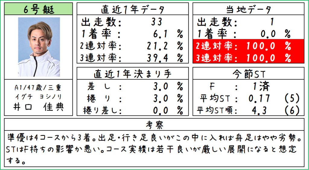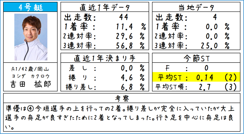 準優は4コースから3着。出足・行き足良いがこの中に入れば舟足はやや劣勢。STはF持ちの影響か悪い。コース実績は若干良いが厳しい展開になると想定する。
