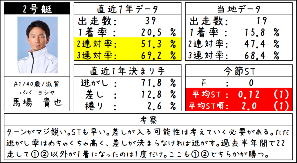 また、大上選手のSTが遅いことも馬場選手にとっては好材料です。