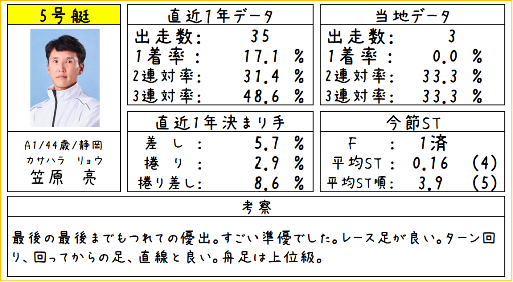 そして、⑤笠原選手。③田村選手よりも舟足が良いと見ていて、1Mで少し流れていく田村選手の内側を切り込んでくると思います。
