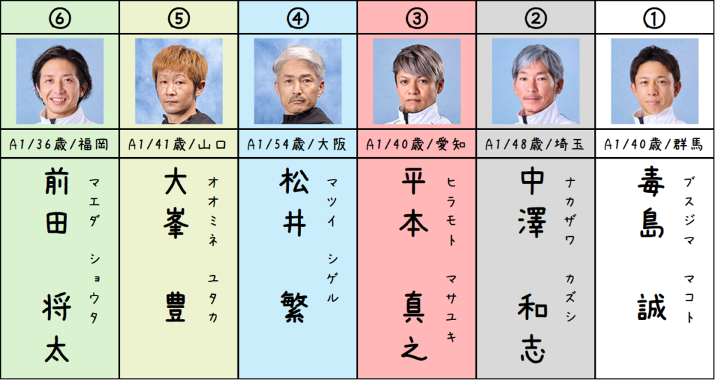 ③平本選手、⑤大峰選手、⑥前田選手が良くて、④松井選手がやや劣勢と見ています。