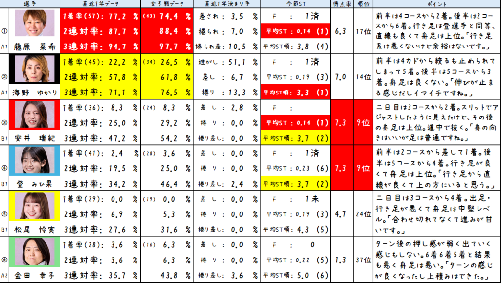 この場合には、展開が向いてくる④登選手とインの①藤原選手を二着とし、三着には舟足が悪くコース実績も弱い⑤松尾選手を除いて3-14-1246この6点をまずは考えました。