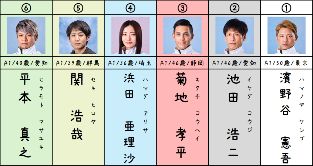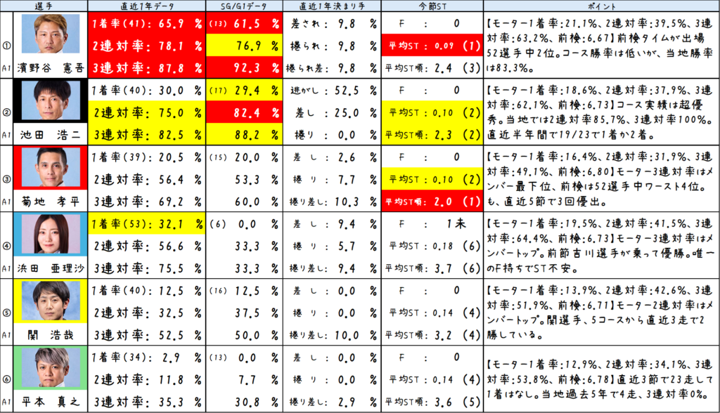 ④浜田選手は一般戦データでは3連対率75.5%と優秀なコース実績を残しています。モーターは前回吉川選手が乗って優勝したモーターですし、モーター3連対率はメンバーで最も高い64.4%となっています。F持ちでSTに不安がありますが、ここはモーターの素性を生かして3着に残すことも考えたいです。