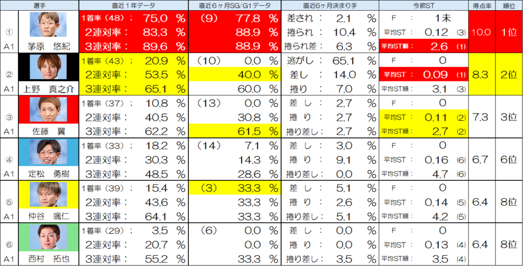 コース実績を見てみても、一般戦データ、SG/G1データどちらを見ても上野選手の二連対率が茅原選手に次ぐ数値となっているということもあります。