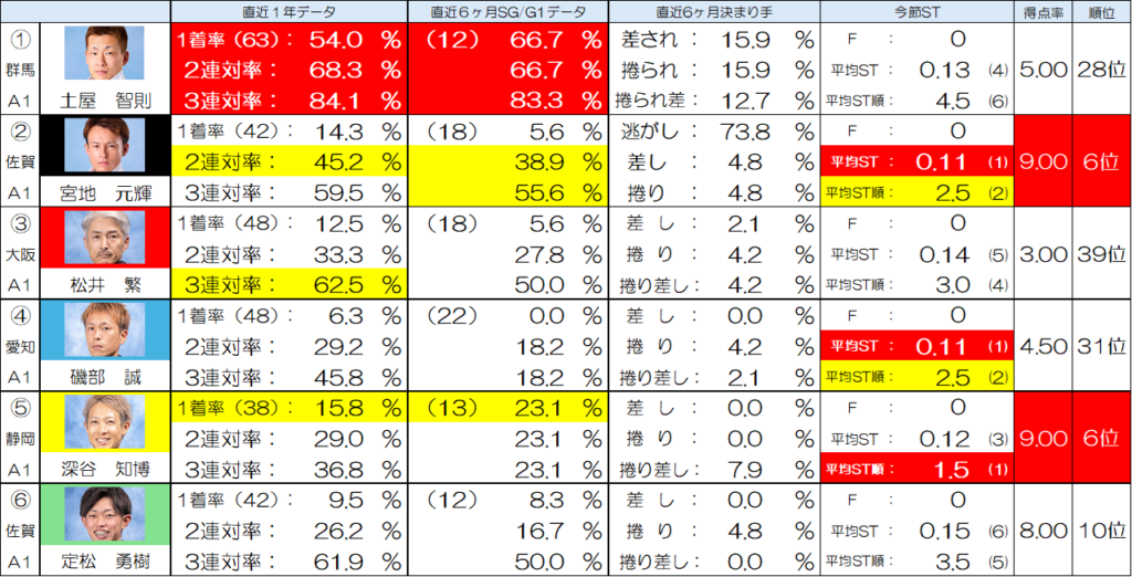 特に定松選手に至っては6コースからの3連対率が一般戦では61.9%、SG/G1でも50%とかなり優秀な数値となっていますので、ここは考えていきたいと思います。